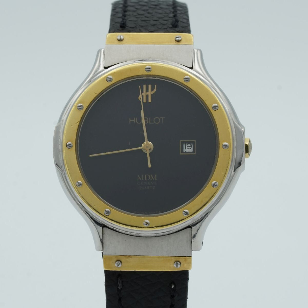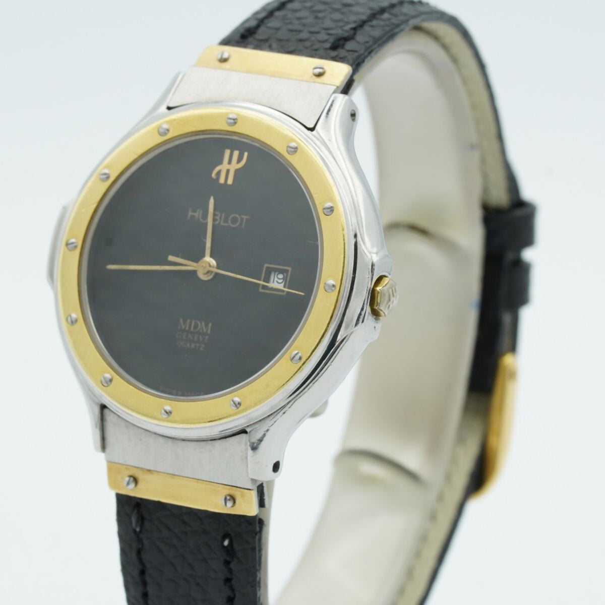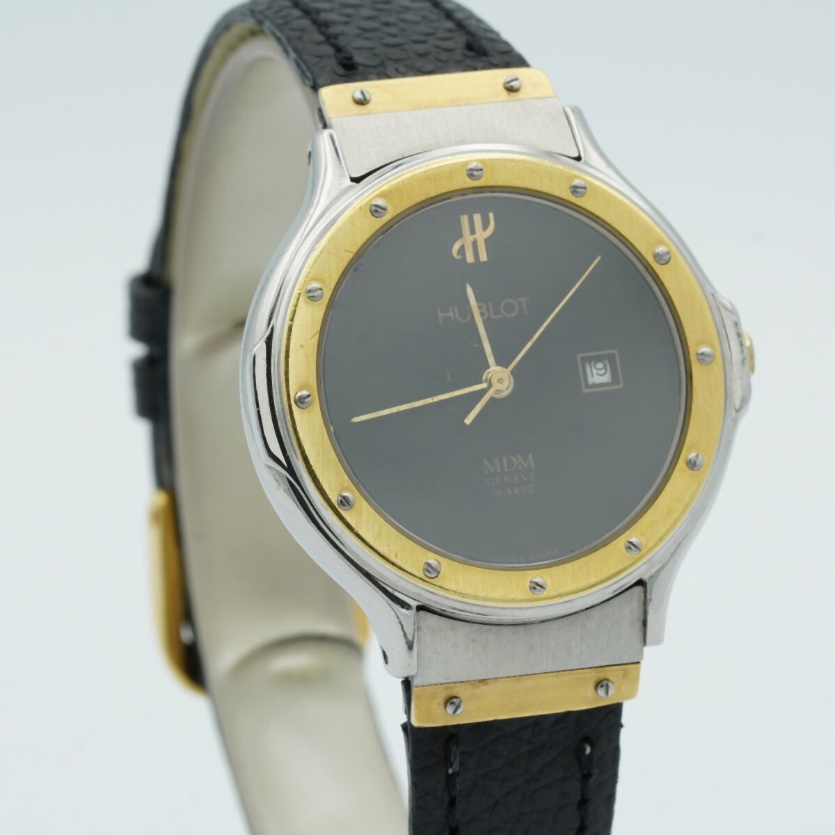 HUBLOT MDM QUARZ DAMEN UHR 28MM STAHL/GOLD LEDER BAND VINTAGE ARMBANDUHR HU002