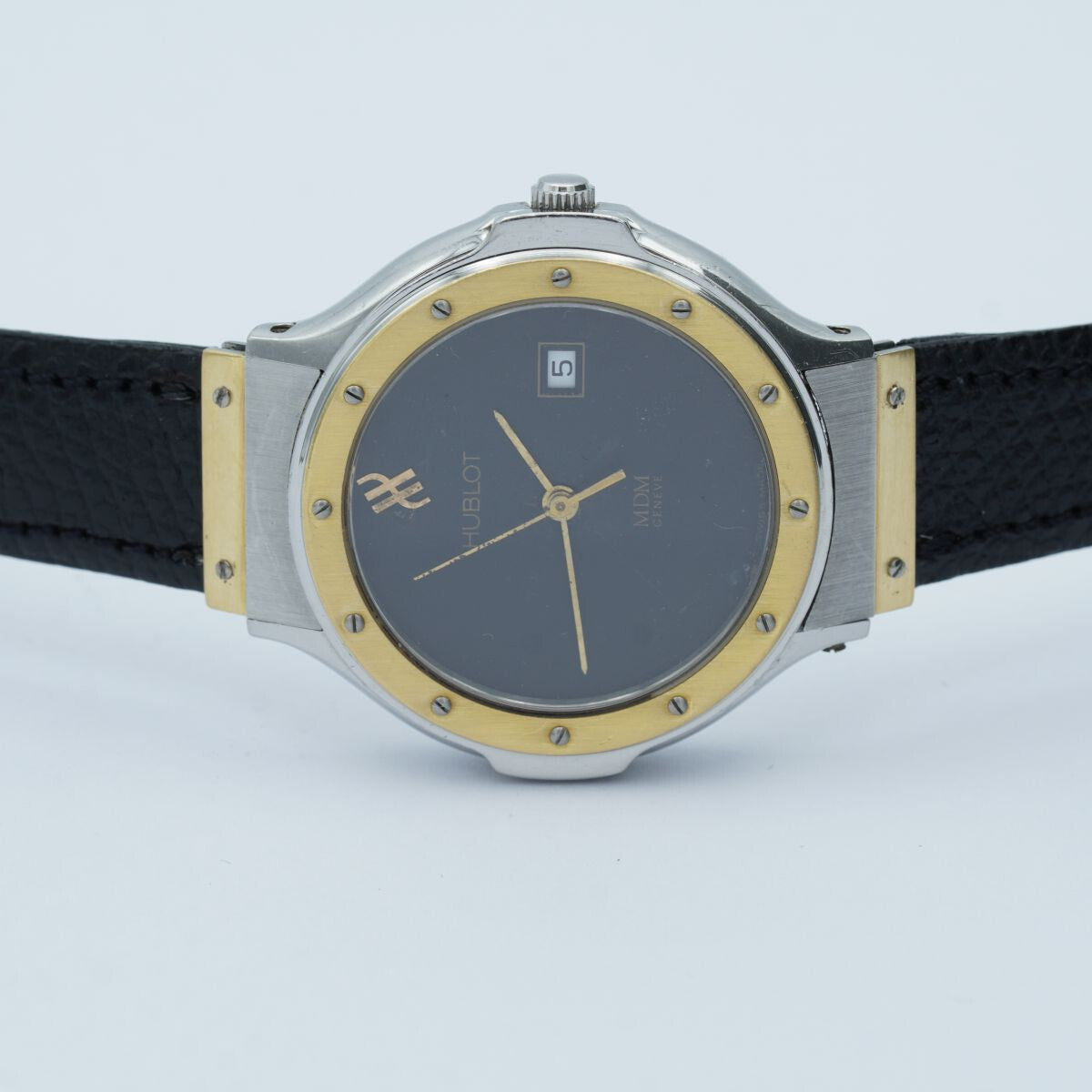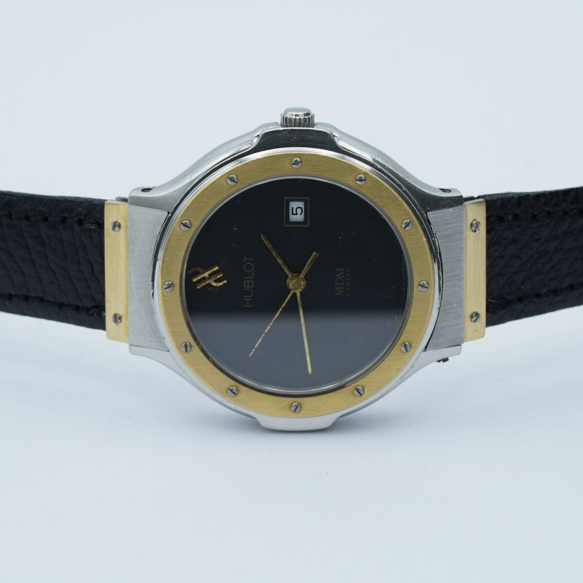 HUBLOT MDM QUARZ DAMEN UHR 28MM STAHL/GOLD LEDER BAND VINTAGE ARMBANDUHR HU014