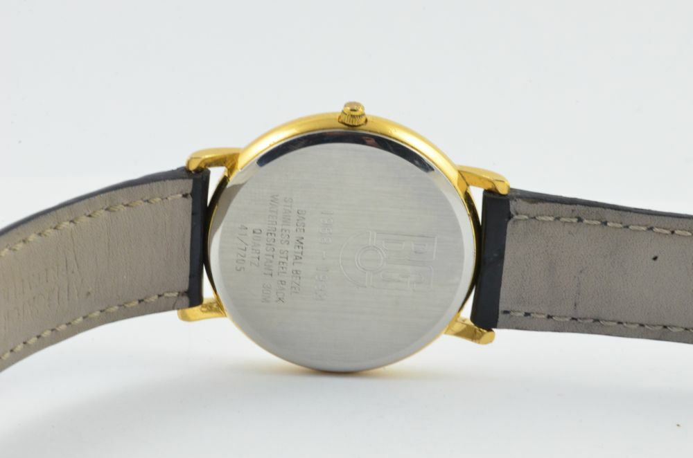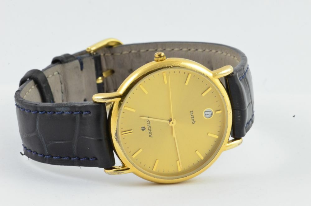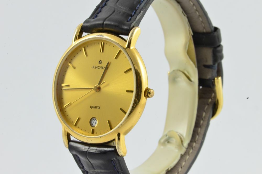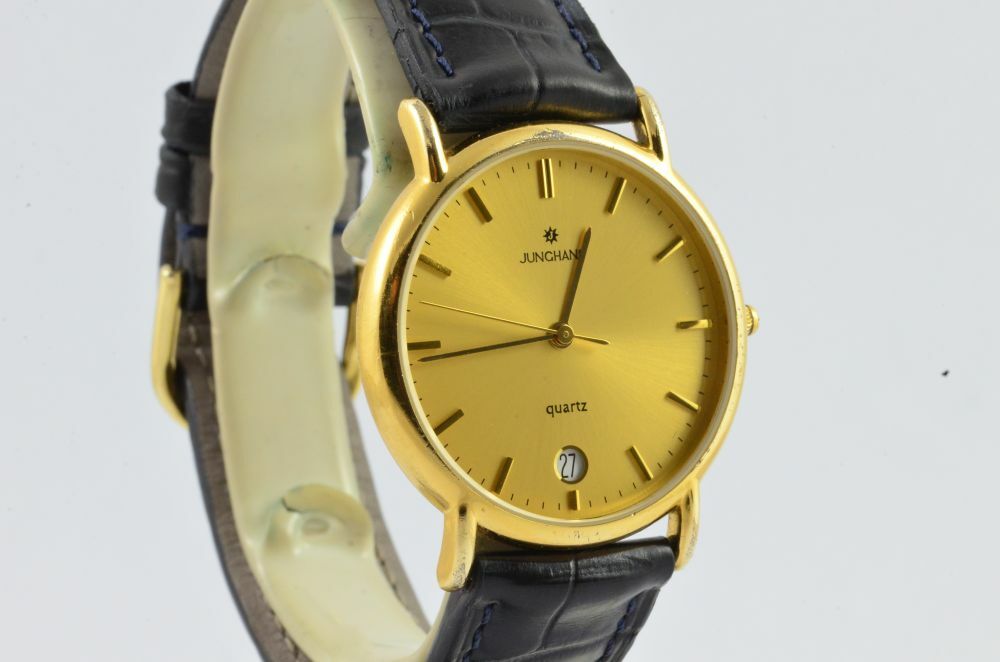 JUNGHANS HERREN UHR 34MM STAHL VERGOLDET VINTAGE RAR MIT LEDER BAND QUARZ 5