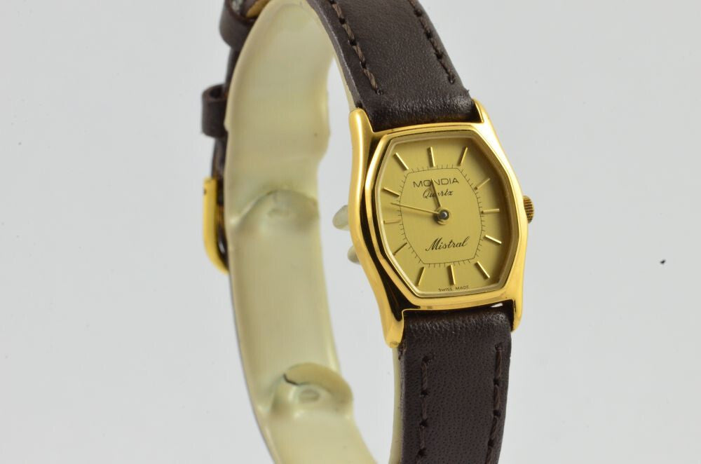MONDIA DAMEN UHR QUARZ VINTAGE 20MM STAHL VERGOLDET ARMBANDUHR VINTAGE RAR